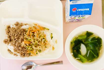 切り干し大根、きゅうり、にんじんを使った野菜の具材には、いりごまをまぶして風味の良い味付けにし、ひき肉にはコチジャンを使った甘辛い味付けにしています。どの学年にも大好評で「おいしくて、おいしくて、おなかいっぱいになった!」と、声をかけてくれる子もいました。