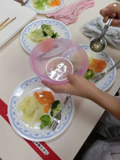 ドレッシングもサラダ油や酢を使って、自分たちで味付けしたことで子どもたちは満足そうでした。