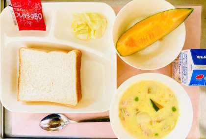 給食室で作ったホワイトルウを使用しています。まろやかな味付けで、子どもたちが大好きな献立です。今日も教室では、おかわりの列ができていました。