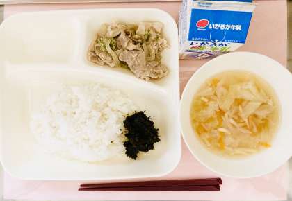 刻み海苔、かつおぶし、しいたけを使用し、濃口醤油等の調味料と合わせて給食室で作りました。香りが良く、優しい味付けで、ごはんがすすむ献立でした。