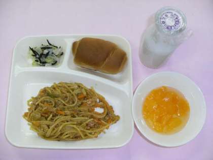 豚挽肉、ベーコン、にんにく、にんじん、たまねぎ、ピーマン、トマト缶と具材もたっぷりで、子どもたちが大好きなカレー味のスパゲッティです。