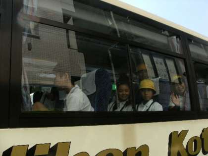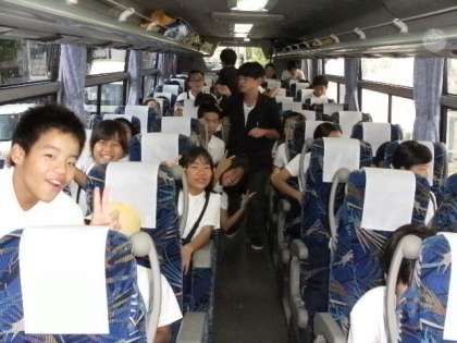 修学旅行は大阪府立海洋センターまでバス2台で行きます。お見送りに来てくれたたくさんの保護者の皆さんに手を振って出発です。どんな3日間になるのでしょう?