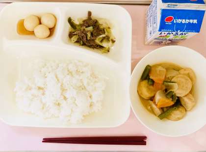 削り節の出汁で具材を煮込み、赤みそ、濃口醤油、砂糖で味付けをしています。丸い食材がたくさん入っていて、お月見の雰囲気が感じられる献立でした。