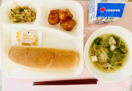 コチジャン、ケチャップ、濃口醤油、砂糖、みりん等を使って調味液を作り、油で揚げた鶏肉にからめて仕上げています。コクのある味付けで、どの学年でも大好評でした。