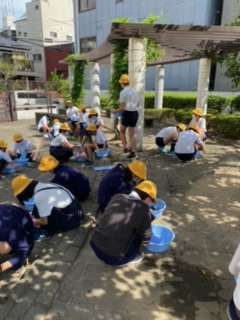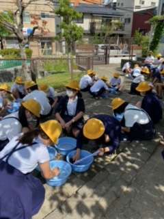 今日は1組は家庭科の学習で洗濯をしました。履いていた靴下を、丁寧に一つずつ手洗いしました。もみ洗い、つまみ洗いを実践して、洗濯板も使って洗いました。いいお天気だったので、帰る頃には乾いていました。