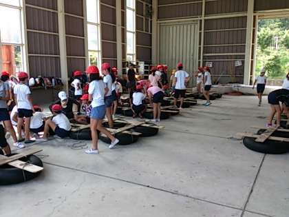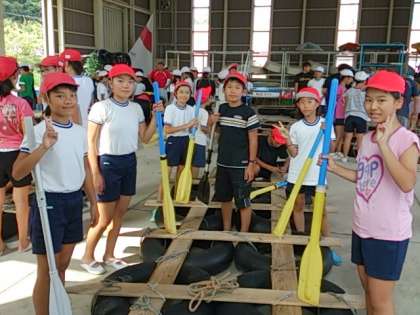 いかだを海に出して、競争したり水をかけたりしました。