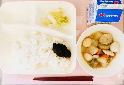 大根、にんじん、厚揚げ、うずら卵、じゃがいも等、色々な具材を使用しています。出汁までおいしく食べられる献立でした。