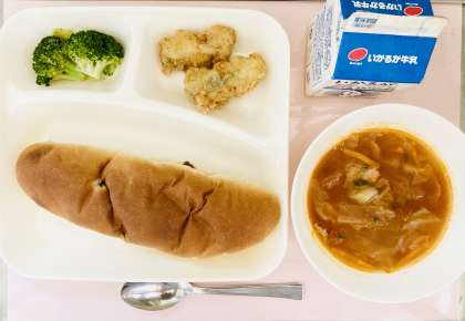 キャベツ、にんじん、玉ねぎなどの野菜がたっぷり入っていました。今日のような肌寒い日にぴったりの体が温まる献立でした。