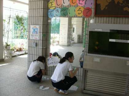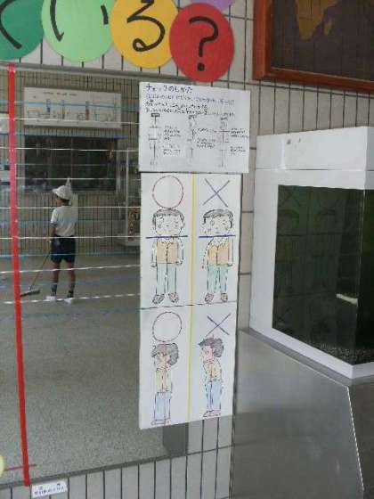 保健の先生と保健実習の学生さんが、鏡に「正しい姿勢ができているかな?」というイラストと身長を測る目盛をつけてくれました。