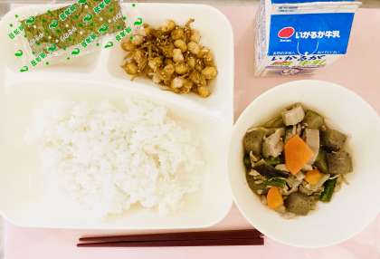 毎回、子どもたちに大好評の献立です。乾燥大豆を柔らかくなるまで戻し、でんぷんをまぶしてから、油で揚げています。甘辛い味付けのタレ、ちりめんじゃこ、ごまと合わせて仕上げています。噛むほどにおいしさを感じる献立でした。
