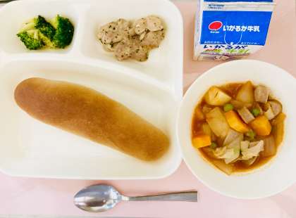 野菜とウインナーをたっぷり使い、ケチャップ、チキンブイヨン等で味付けして煮込んでいます。スープまでおいしく食べられる献立でした。