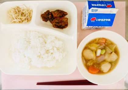 くじらには、生姜汁、料理酒で下味をつけ、でんぷんをまぶし、油で揚げています。赤味噌、ケチャップ、砂糖を合わせて作ったソースに絡めて仕上げています。余分な臭味がなく、食べやすい味付けで、子どもたちに大好評でした。