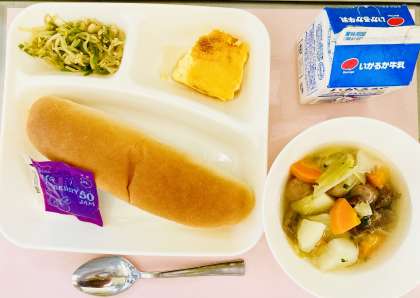 カラメルソースとプリン液を作り、1クラス分ずつバットに入れて、オーブンで蒸し焼きにしています。大きなプリン(1クラス分)を見て、子どもたちは「めっちゃ大きいプリン!すごい!」「いいにおい!おいしそう!」と、嬉しそうに切り分けていました。どの学年でも大好評でした。