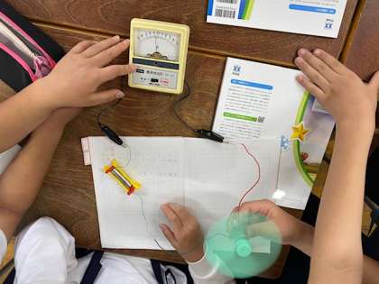 かん電池とモーターの回る向きの関係を調べるために自分たちで回路を作り、かんい検流計を使って実験をしました。