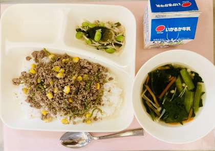牛挽き肉、豚挽き肉、コーン、ピーマンをたっぷり使っています。生姜の風味も加わり、ご飯のすすむ味付けでした。