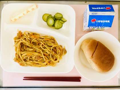 豚ひき肉、ベーコン、野菜等がたっぷり入った具だくさんのスパゲッティです。どの学年でも大好評で、教室では、おかわりの長い列ができていました。