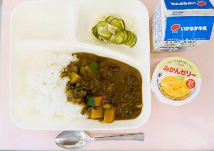 かぼちゃ、なす、トマト(缶)、ピーマン等が入っています。いつものカレーライスとは違いますが、子どもたちは喜んで食べてくれていました。