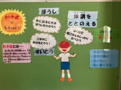 二学期が始まりました。まだまだ厳しい暑さが続くようです。学校では、玄関ホールに温度・湿度、熱中症の危険レベルを表示しています。また職員室前には、熱中症を防ぐための方法を掲示をしています。