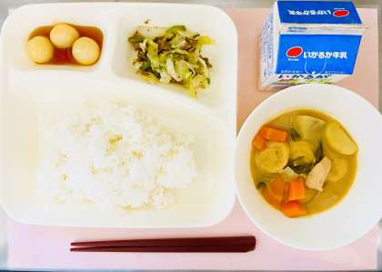 今日の給食には「一口がんもと里芋の味噌煮」「みたらし団子」が登場しました。
