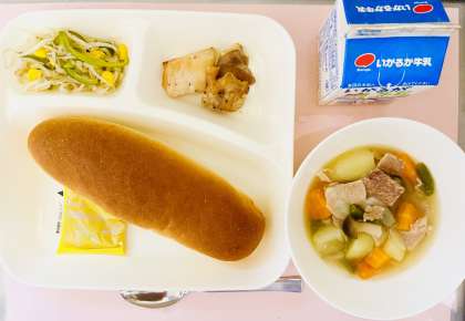 鶏肉にガーリック、こしょう(粗挽き)、濃口醤油等を使って下味を付け、オーブンで蒸し焼きにしています。ガーリックの香りとスパイシーな味付けで、子どもたちに大好評でした。