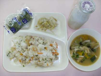 鶏肉、ちくわ、にんじん、三度豆を使用した混ぜごはんです。食べる時に1人1袋あてのきざみのりをかけて食べます。