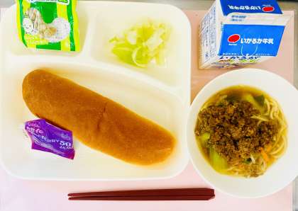 テンメンジャン、濃口醤油等で味付けした挽肉を、スープ、中華麺の上にのせた献立です。子どもたちに大好評で、教室にはおかわりの列ができていました。
