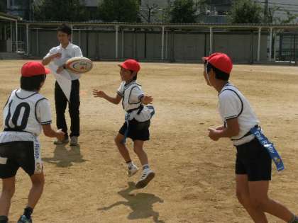 タグラグビーは、バスケットボールやサッカーのよう運動経験が豊富な子とそうでない子との技術的な差が比較的少なく、誰でも活躍できる可能性のあるゲームとして体育科に取り入れられています。また、子ども達が考えた作戦が成功しやすい教材でもあります。