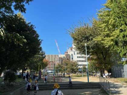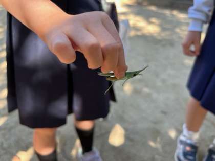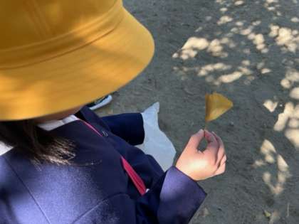 10月31日(火)に寺田町公園へ行き、秋探しをしました。落ち葉やどんぐり、木の実などを拾いました。「赤い葉があって秋っぽいね!」「バッタがいたよ!」とたくさん発見がありました。