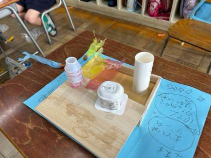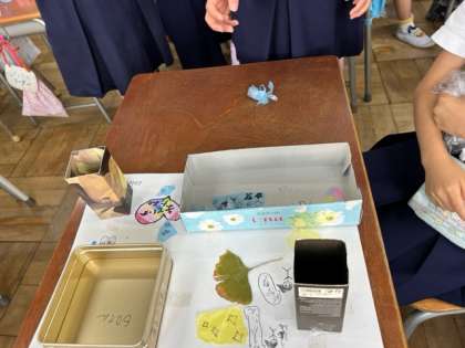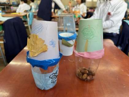 生活科の学習で、どんぐりやまつぼっくりなどの秋のものを使ったおもちゃを作りました。作るのもみんなで遊ぶのも楽しかったようで、どちらも笑顔で活動していました。「こまは太いどんぐりの方がたくさん回った!」「マラカスは友だちのものと自分のものでは音が違ったよ。」など色々な気づきもありました。