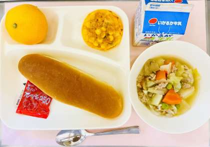 豚肉や野菜がたっぷり入った具だくさんのスープ煮です。体の温まる献立で、子どもたちは喜んで食べてくれていました。