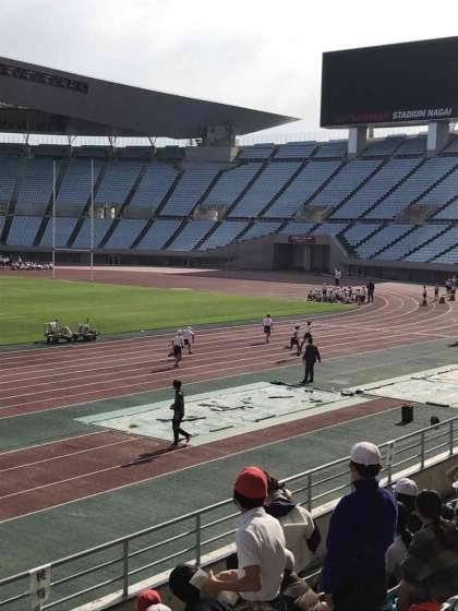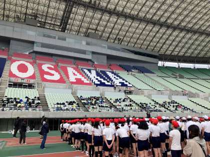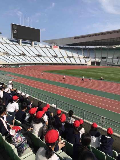 天候にも恵まれ、開催することができました。100m走と400mリレーを行いました。プロの選手が走る場所と同じところで、競技をすることができ、大興奮です。天王寺区の小学校が集まっているため、他の学校の友達とも競技を通じて交流できました。