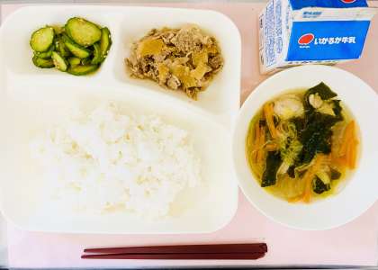 鶏肉の他に、色々な野菜と春雨(じゃがいもでんぷんを材料として作られたもの)が入ったスープです。具材のおいしさが味わえる献立でした。