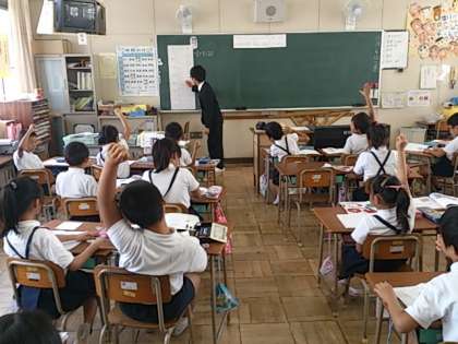 写真はみんなよく手を挙げ、しっかりと発言しているようすです。先生が子どもの目線でやさしく話しかけていますね。