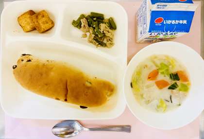 白菜、にんじん、チンゲンサイ等の野菜がたっぷり入ったクリーム煮です。とろみがあり、体の温まる献立で、子どもたちに大好評でした。