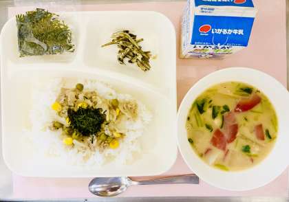 ごはんと具材を混ぜ合わせると「ちらしずし」になる献立です。食べる時に刻み海苔をかけていただきます。