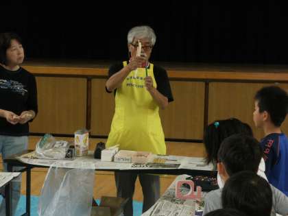 いつも頭の中はおもちゃのアイディアでいっぱい。」材料は牛乳パックや割り箸、葉っぱ等々、再利用品や自然のものがほとんどで「おもちゃは何からでも作れるんですよ。」と笑う。 西淀川区の広報紙より(平成25年5月1日号)
