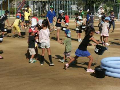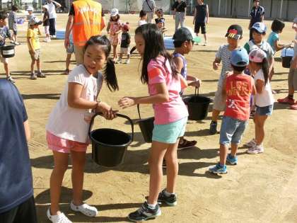 次の写真は、バケツリレー体験です。まさにリレー競技になっていて、水を早く運んだチームが勝ちです。