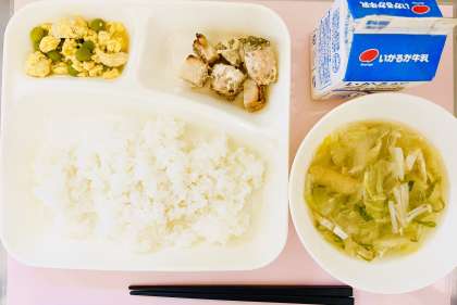 えんどうの旬は春から夏の初めにかけてです。今日は、給食室で「さや」から取り出したえんどうを使っています。