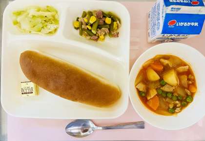 鶏肉と野菜を炒めてからチキンブイヨン、ケチャップ等を加えて煮込んでいます。スープまでおいしく食べられる味付けで、どの学年でも大好評でした。