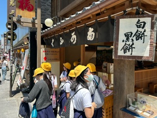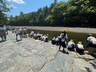 内宮とおかげ横丁に分かれての見学開始です。おかげ横丁では、おかげ横丁ならではの美味しいものを食べていました!また、内宮では、校長先生から伊勢神宮についての説明を聞くことができました!子どもたちは、興味津々に聞いていました。