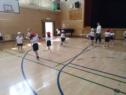 フラフープを何本も腰で回している児童も。