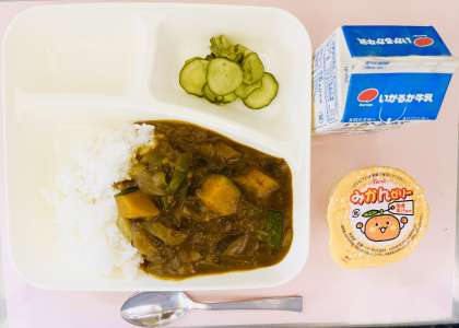かぼちゃ、なす、ピーマン、トマト(缶)などの野菜がたっぷり入ったカレーライスです。野菜の甘味が感じられ、子どもたちに大好評でした。