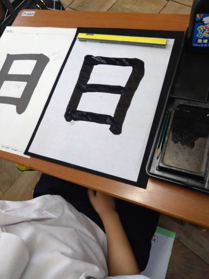 手本を見ながら折れに気をつけ、とても丁寧に書いていました。