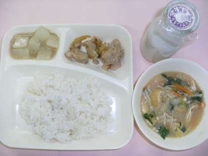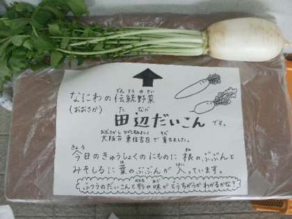地場産物の活用として、なにわの伝統野菜である「田辺だいこん」を使用した煮ものです。「田辺だいこん」は、生産量の関係で各区5年に1度しか味わえない野菜です。今年は北区・浪速区・東住吉区・天王寺区・住吉区で使用されます。
