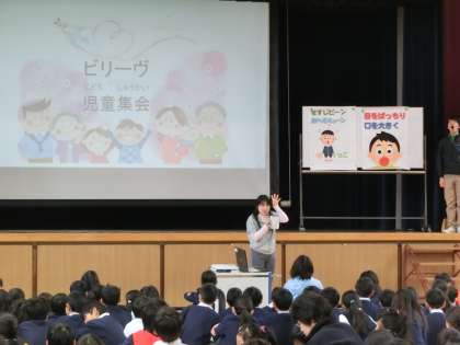 全校集会で2学期の歌♪ビリープを歌いました。大きな口をあけて せすじをのばして、頭の上から声を出して合唱。最後は手話をつけて♪アーイ ビリープ フューチャー 信じてる〜 みんなで歌うってすてきです。