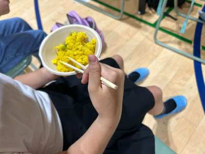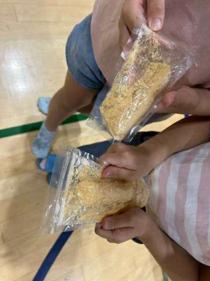 夕食は非常用のアルファ化米をつかったパエリアとお団子でした。とてもおいしくて「もっと食べたい」と言っている子どもたちもいました。