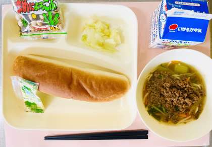 チンゲンサイ、にんじん等の野菜を加えて「汁めん」を作り、盛り付けの時に、テンメンジャン等で味付けしたひき肉をのせた献立です。「おおきなお椀で、山盛りにして食べたかった!」と、喜んで食べてくれた子もいました。