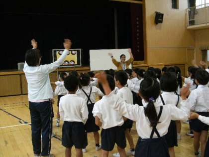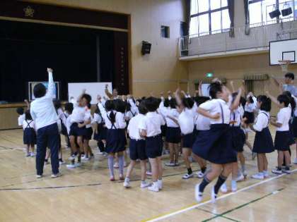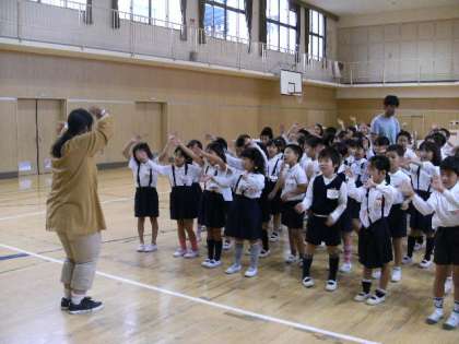 2年生はノリノリで、講堂で行った授業も、子ども達は所狭しと跳ね回り、ジャンプして声を出していました。