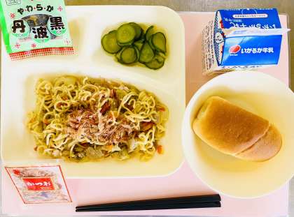 薄口醤油、濃口醤油、塩、こしょうを使って味付けしています。喫食時にかつお節をかけていただきます。「いつものソースの焼きそばが好きだけど、この焼きそばも、おいしかった!」と、気に入ってくれた子もいました。どの学年の食缶も空っぽで返却され、大好評でした。