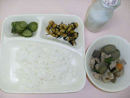 大豆を油で揚げ、ひじき、砂糖、しょうゆで作ったタレをからませます。